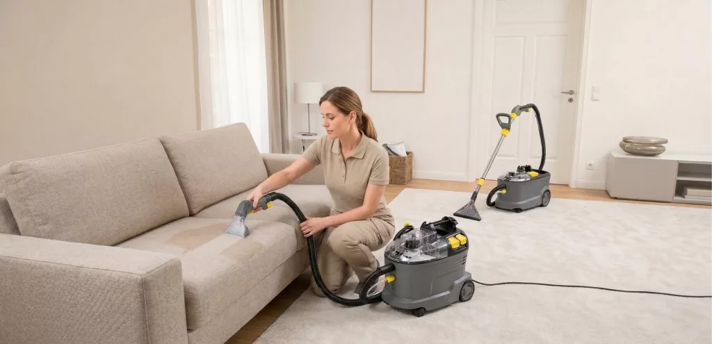 „Nase zu? Augen jucken? Dein Sofa könnte der Grund sein! Ein normaler Staubsauger wirbelt Allergene oft nur auf. Wir spülen sie raus!“